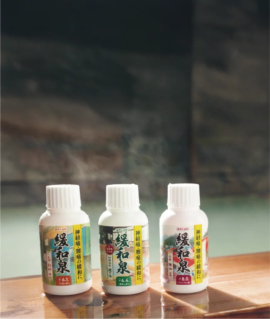 “なんとなく気持ちいい”ではなく、「確かに効いた」と実感できるものを届けたい。 緩和泉は、日本各地に古くから続く本物の湯治場に着目し、「泉質・液性・薬効」にこだわって開発した 温泉成分配合の薬用入浴剤シリーズです。